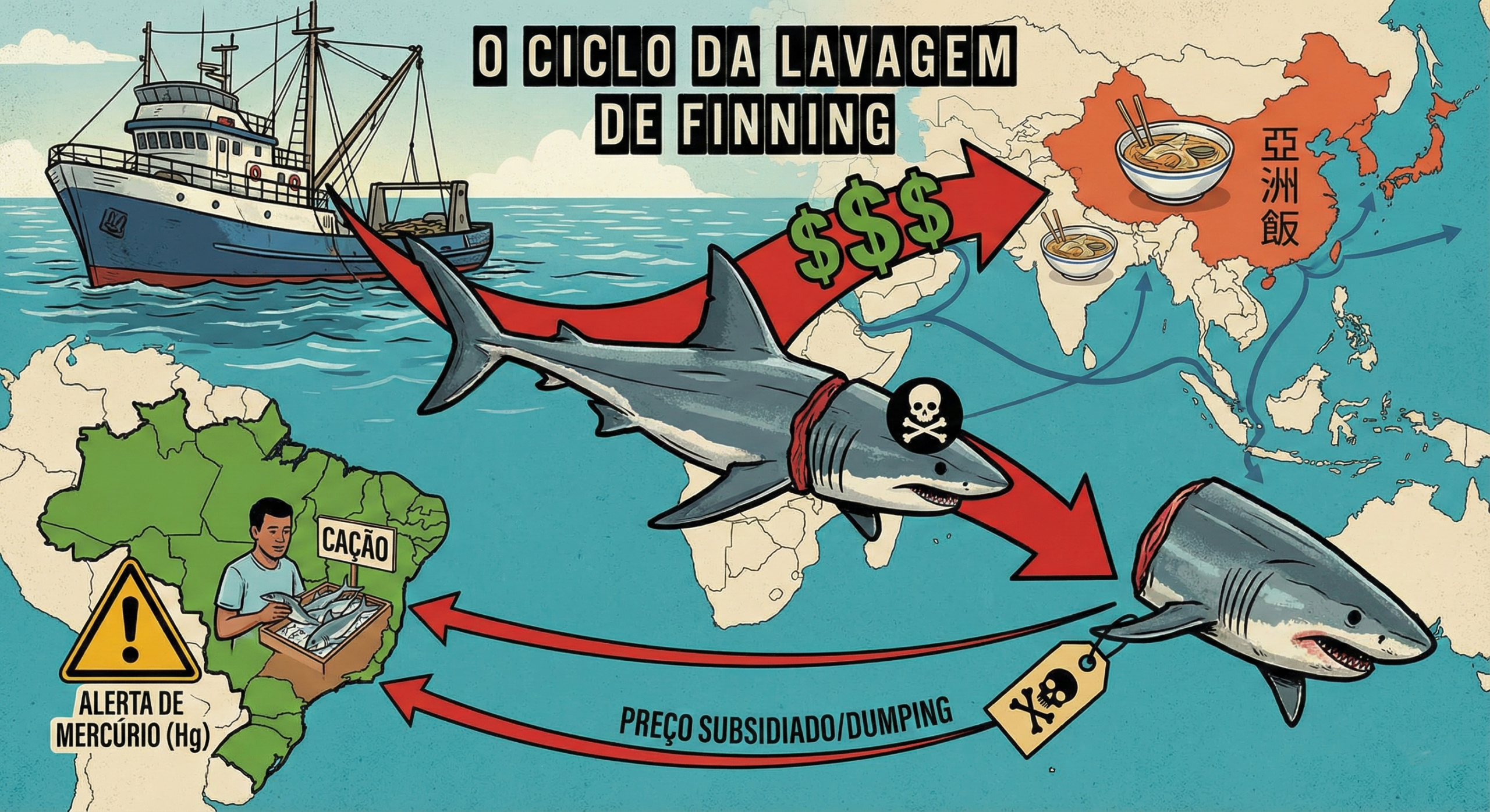Para entender por que o cação é tão barato no Brasil, você precisa entender o conceito de Finning (a prática de cortar as barbatanas do tubarão e jogar o corpo, ainda vivo, de volta ao mar para sangrar até a morte).